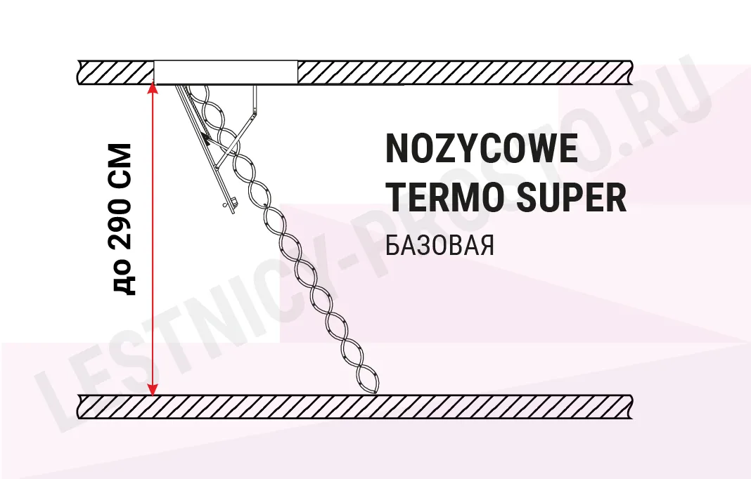 Модель лестницы, благодаря использованию цельнометаллической ножничной конструкции, идеально подходит для установки в помещениях высотой до 290 см. Выбор лестницы NOZYCOWE TERMO SUPER - это инвестиция, которая позволяет минимизировать потери теплого воздуха  и значительно снизить расходы на отопление.