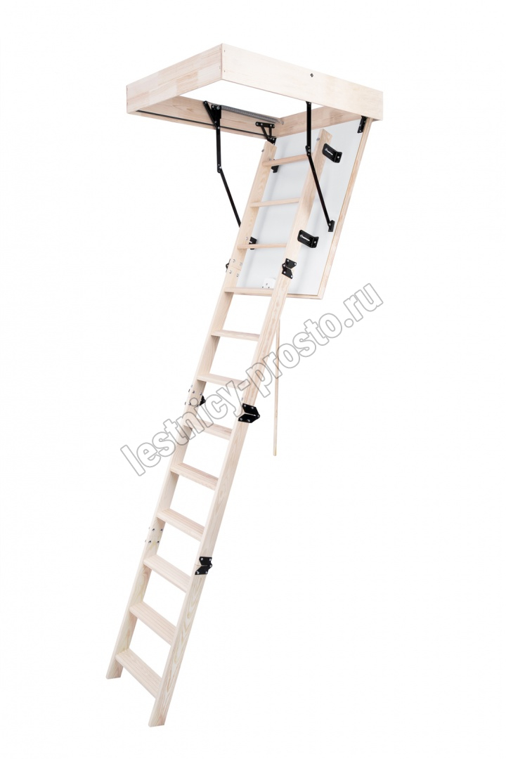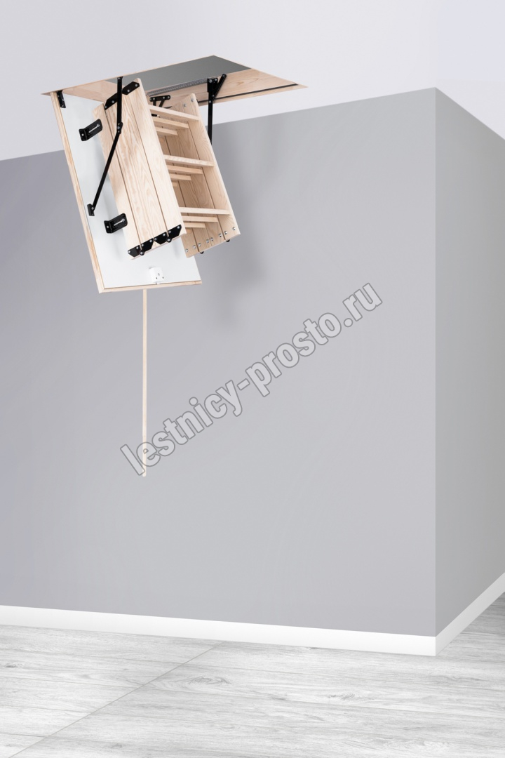 Лестница складная четырехсекционная, изготовлена из массива сосны. Термоизоляционная крышка типа "сэндвич" утеплена пенопластом толщиной 20 мм, облицована с двух сторон ДСП белого цвета.