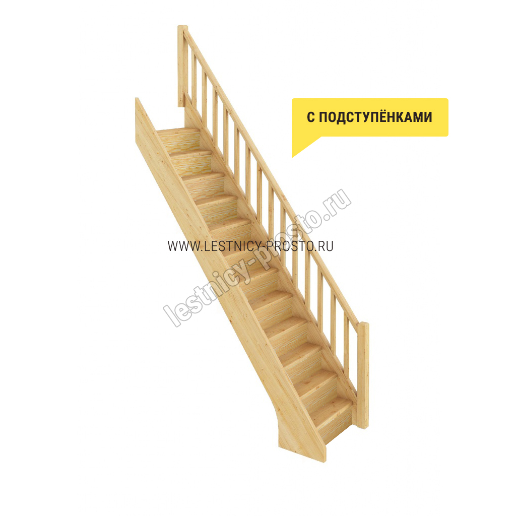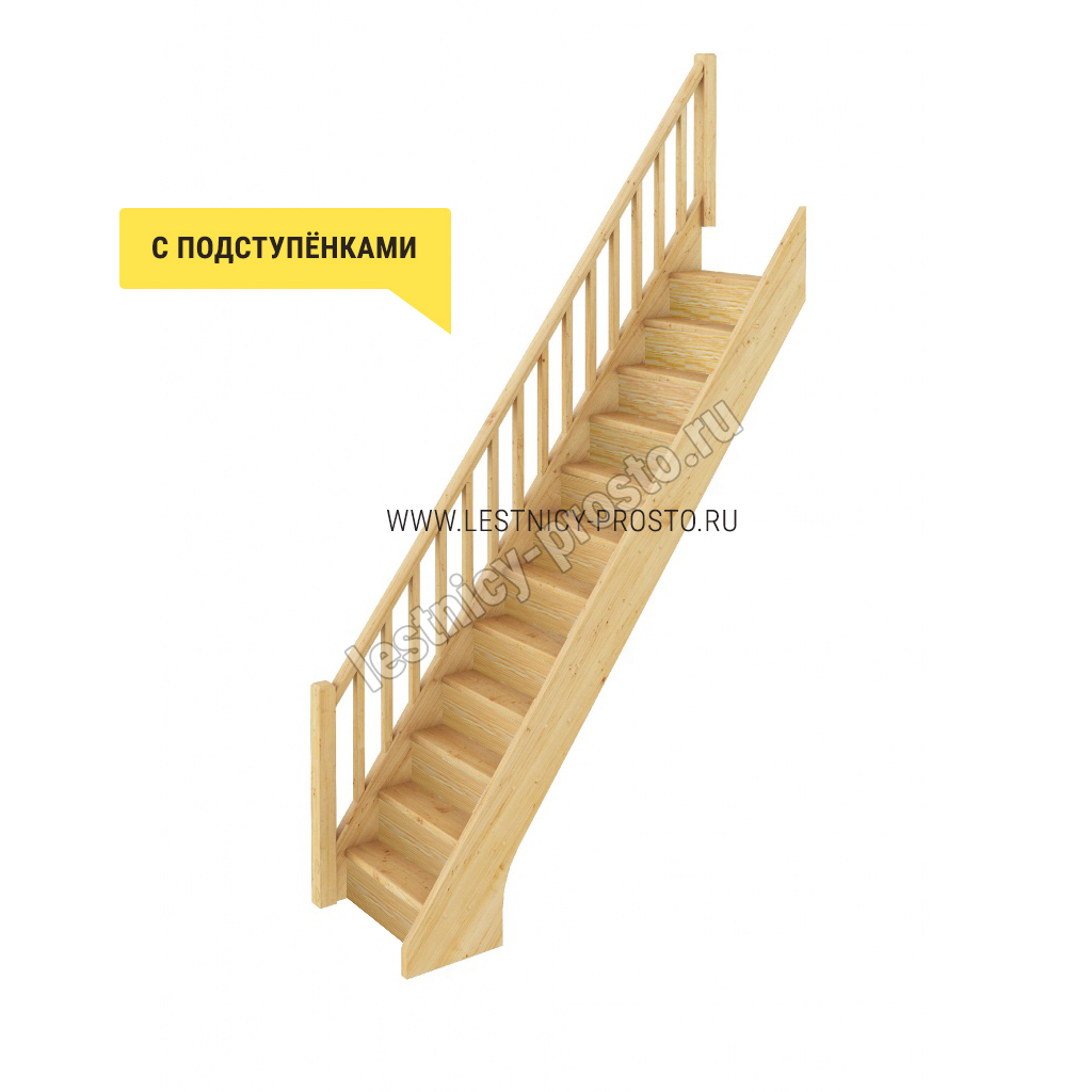 Базовый комплект включает в себя деревянные элементы лестницы и ограждения без какого-либо покрытия. Ограждение можно установить слева или справа. Увеличить высоту лестницы можно установив снизу подиум, точная подгонка высоты под необходимые параметры осуществляется засчет регулировки верхнего шага лестницы.