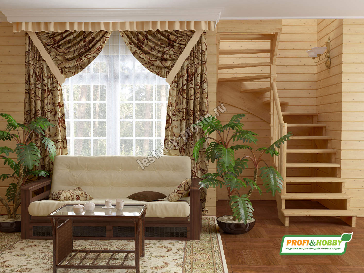 Базовый комплект включает в себя деревянные элементы лестницы и ограждения ;без какого-либо покрытия.