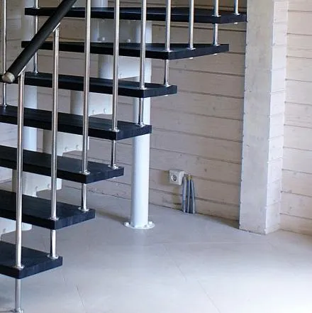 В комплекте: 3 прямых столба и профильный поручень без покрытия, комплект из 3 ригелей из стали (окрашены в цвет каркаса или хром по желанию) диаметром 12 мм. Ограждение начинается со второй ступени.