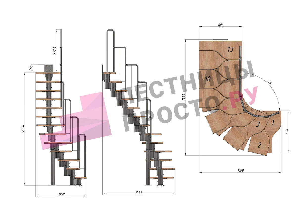 Лестница Prosto Urban Black гусиный шаг 600 мм, h234-336 см (13 ступеней), ясень